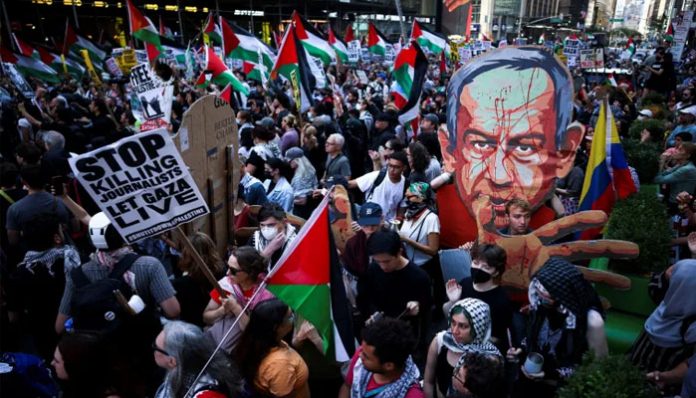 نیتن یاہو کے خطاب کے دوران اقوام متحدہ کی عمارت کے باہر احتجاج، اسرائیل پر پابندیوں کا مطالبہ